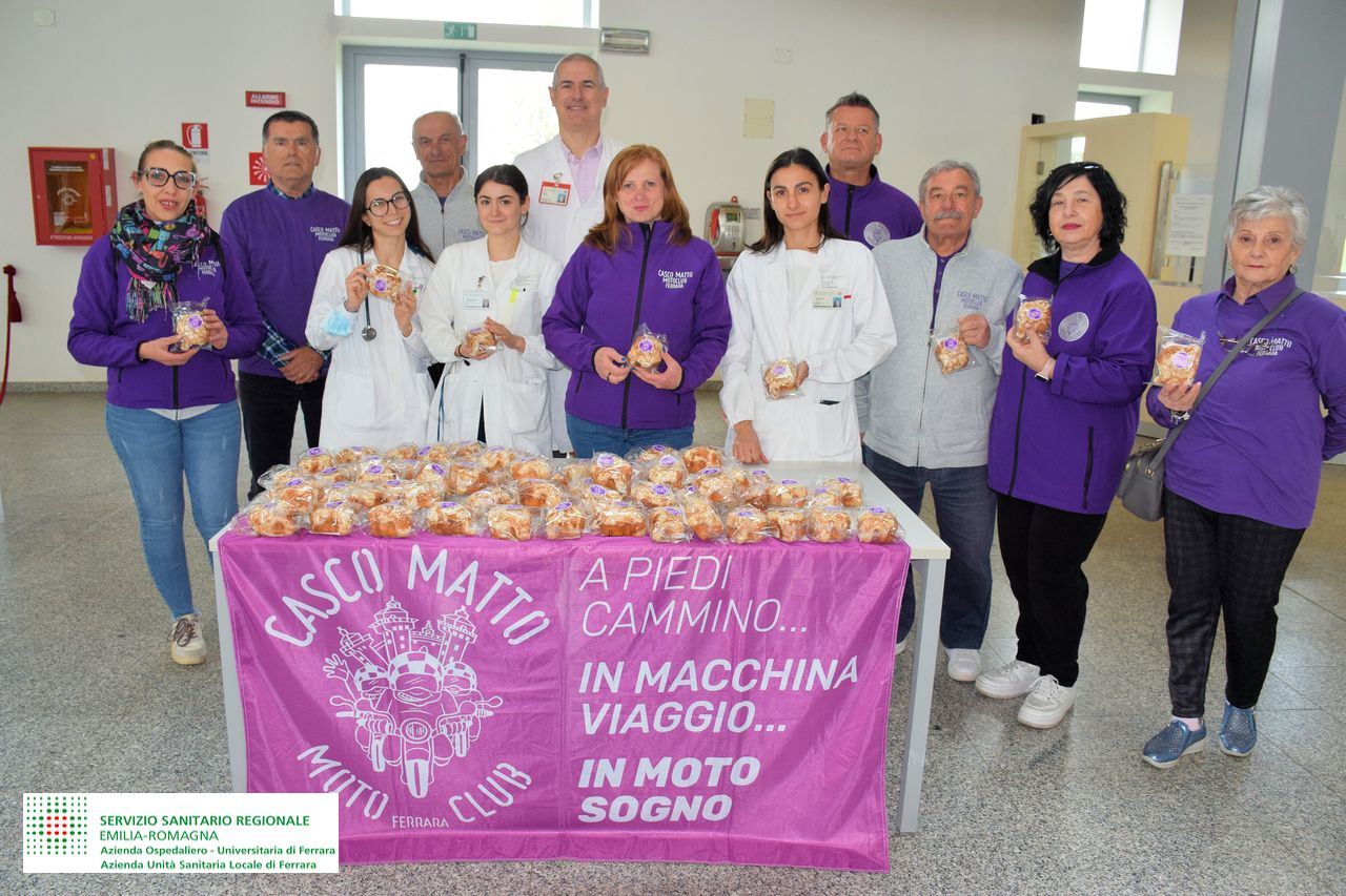 Oggi, venerdì 27 marzo 2026, il motoclub “Casco Matto” ha consegnato delle piccole colombe tradizionali pasquali nel reparto di Geriatria dell’Ospedale di Cona (Direttore facente funzioni dott. Gianluca Guerra). Il sodalizio è già stato impegnato, in passato, in azioni di solidarietà rivolte alle persone ricoverate nella struttura sanitaria di Ferrara.