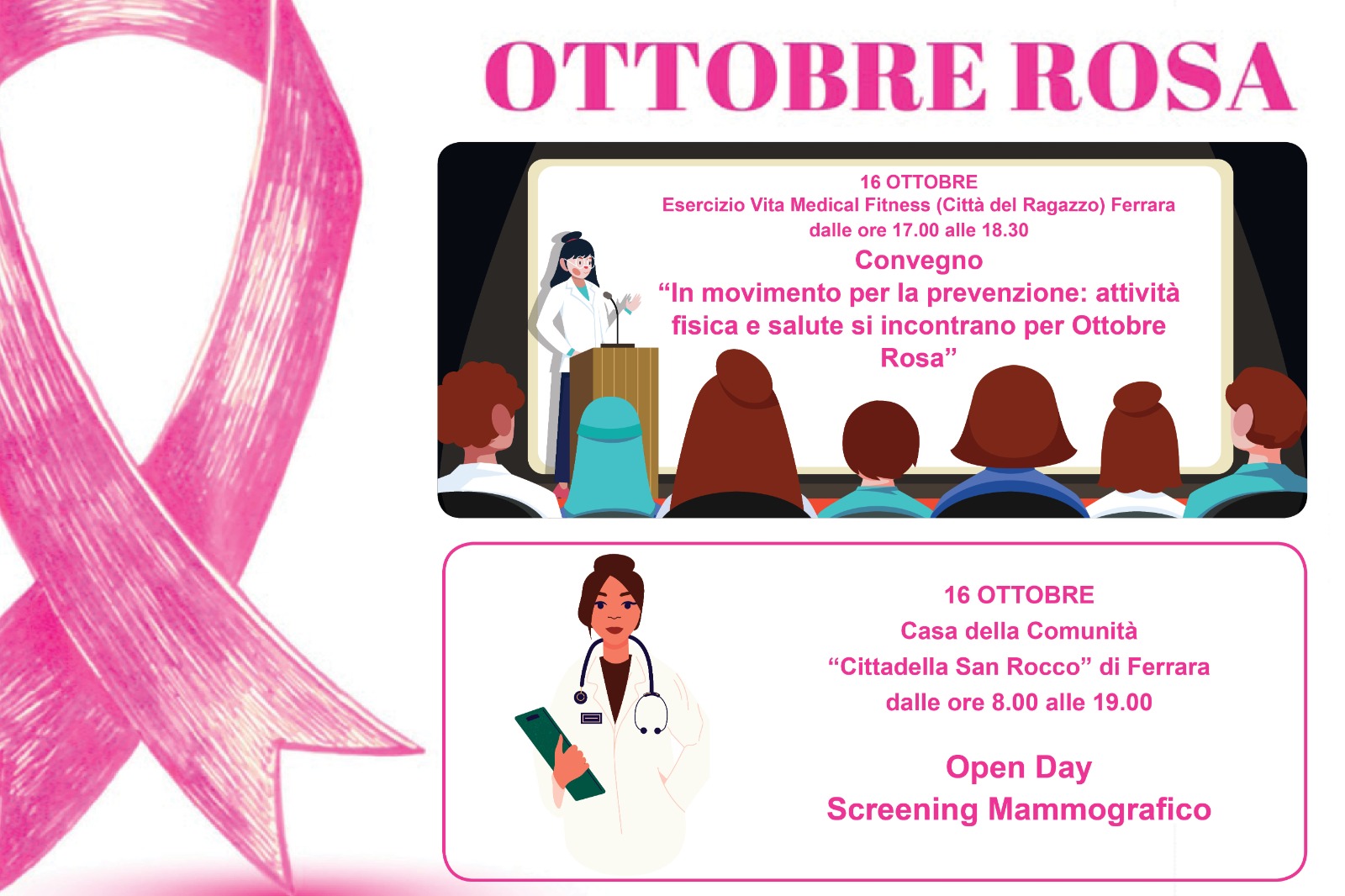 La giornata di giovedì 16 ottobre 2025 vedrà lo svolgimento di due importanti iniziative in contemporanea. La prima è un Open Day Screening Mammografico, programmato per un orario esteso dalle 8.00 alle 19.00, che avrà luogo presso la Senologia della Casa della Comunità Cittadella S. Rocco. Questi Open Day di Screening Mammografico sono organizzati dalla dott.ssa Caterina Palmonari e dalla dott.ssa Angela Gentile, quest'ultima Responsabile della Senologia AUSL di Ferrara. Nel corso dell'evento, alle ore 9:45 la Direttrice Generale delle Aziende Sanitarie ferraresi Nicoletta Natalini porterà il proprio saluto. Inoltre l'Assessore Cristina Coletti (Politiche Sociali) consegnerà alle donne partecipanti le magliette celebrative con il logo di “Ottobre Rosa” realizzate dal Comune di Ferrara. Agli screening mammografici possono accedere le donne con i seguenti requisiti: età anagrafica compresa tra i 45 e i 74 anni, ovvero in età da screening; ricezione di una lettera da parte del Centro Screening a cui non hanno risposto e che non abbiano eseguito mammografie spontanee da almeno 12 mesi. Non è necessaria alcuna prenotazione, basta presentarsi con il codice fiscale e la lettera ricevuta.