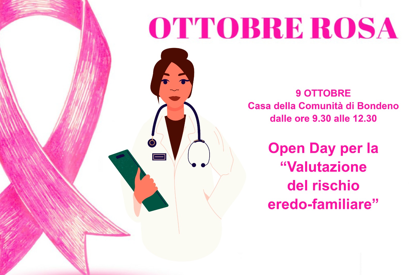 Si prosegue giovedì 9 ottobre 2025 con il primo Open Day per la “Valutazione del rischio eredo-familiare”. Questa sessione si svolgerà dalle 9.30 alle 12.30 presso la Casa della Comunità di Bondeno. L'attività, curata dalla dott.ssa Caterina Palmonari (Direttrice del Centro Screening Oncologici), offrirà la valutazione del rischio di sviluppare tumori che possono interessare la mammella e/o l’ovaio.
