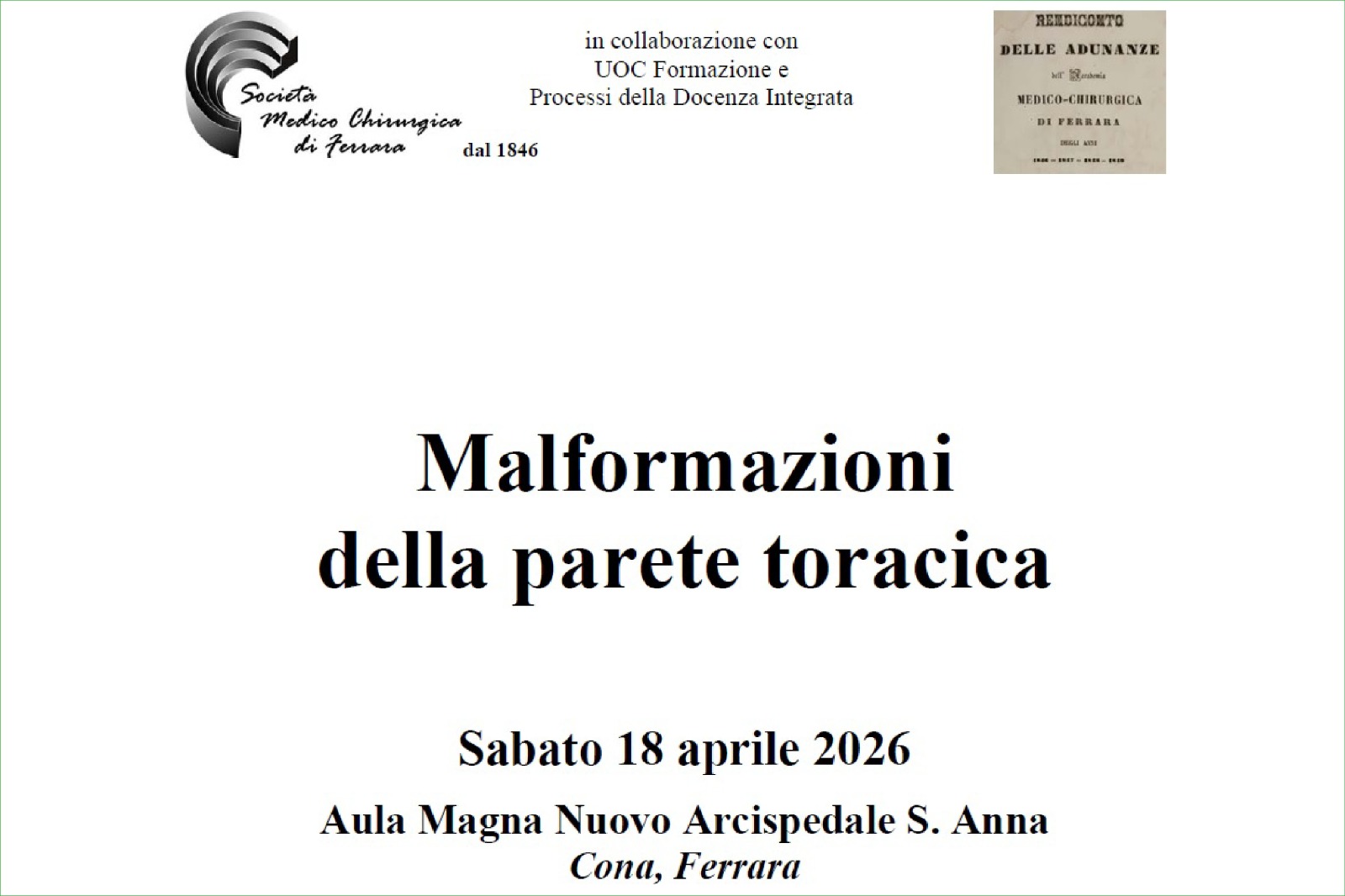“Malformazioni della parete toracica”: questo il titolo dell’appuntamento scientifico organizzato dalla Società Medico Chirurgica di Ferrara che avrà luogo sabato 18 aprile 2026, dalle ore 8.00 alle 13.40, presso l’Aula Magna dell’Ospedale di Cona. L’incontro riunirà professionisti di diverse discipline con l’obiettivo di condividere conoscenze, esperienze e le più recenti novità nella gestione del paziente con malformazioni della parete toracica. L’evento è aperto a medici, chirurghi, fisioterapisti e a tutti i professionisti sanitari interessati.